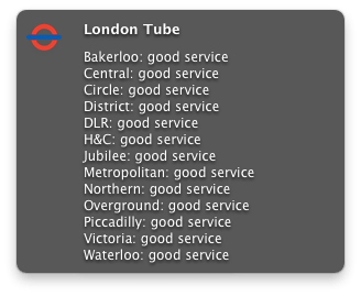 Download the London Tube extension for Alfred Powerpack that displays the status of the London tube lines. Thanks go to Ben Dodson for the TFL data. Just type tube into Alfred and you’ll get this: